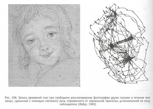 Мигание, как и саккадическое движение глаз, обладает автоматией. В момент напряженной зрительной работы мигания подавляются, а сразу после ее завершения количество миганий резко возрастает. Средний интервал составляет 3,14 ± 0,4 с. Искусственная среда зачастую приводит к утомлению зрительного восприятия человека. С точки зрения физиологии зрения снижение амплитуды саккад следует считать целесообразным для глаз. При формировании видимой среды в окружающем человека пространстве должно быть достаточное количество хорошо различимых глазом предметов. На автоматию саккад влияет ряд факторов: яркость объекта, его размер, конфигурация и четкость. Так, при рассмотрении человеческого лица (рис. 109), которое относится к «сложному» объекту, взгляд обычно фиксирует 3 точки: два глаза и губы, другие части лица рассматриваются бегло. Такое рассматривание осуществляется в основном за счет саккад; «паутина» тонких линий на предлагаемом справа рисунке — это и есть саккады, а черные точки — момент фиксации, во время которого взор на какое-то время сохраняет заданное положение. Внимание наблюдателя привлекают глаза и губы. Это вполне объяснимо с физиологической точки зрения — именно эти участки четко видны наблюдателю и соответственно на фотографии за них легко физически «зацепиться» глазу. Причем, если у наблюдателя будет время, то оно будет затрачено не на рассматривание второстепенных элементов, а на повторный пробег по трем основным точкам. Цикл, по мнению специалистов (см. В.А. Филин «Видеоэкология»), определяется автоматией саккад, модулированной применительно к конкретной ситуации. Программа автоматии саккад вырабатывается саккадическим центром на весь период рассматривания данного объекта. При этом продолжительность маршрута зависит от сложности объекта: чем сложнее объект, тем длиннее маршрут и цикл одной программы. При рассматривании сложных зрительных объектов взгляд человека распределяется не равномерно по