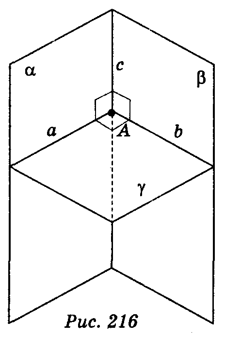 Дві площини, що перетинаються, називаються перпендикулярними, якщо третя площина, проведена перпендикулярно до лінії перетину цих площин, перетинає їх по перпендикулярних прямих. На рис. 216 α