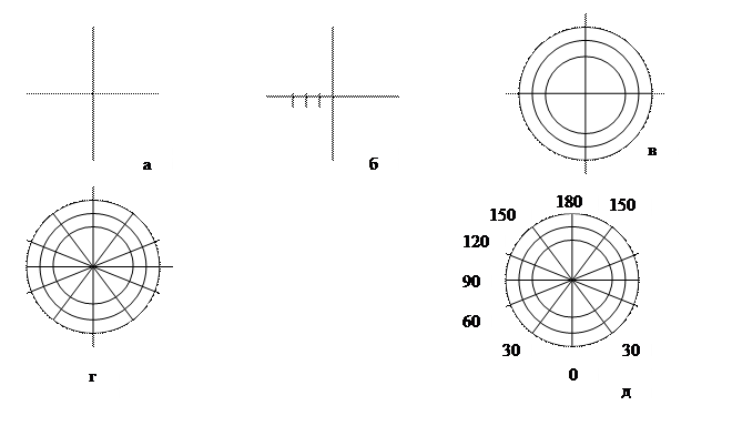 Построение картографических сеток азимутальных ортографических проекций производят в следующей последовательности: А) на бумаге построить две взаимно перпендикулярные прямые линии (рис. а) – два меридиана строящейся сетки; Б) на одном из меридианов от полюса отложить все вычисленные радиусы параллелей (б); В) через отмеченные точки провести окружности – параллели строящейся сетки (в) Г) используя полюс в качестве центра, при помощи транспортира разметить углы между остальными меридианами (г) Д) удалить с чертежа излишни части линий, подписать у меридианов долготы, а у параллелей – широты.