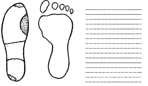Задание № 16. 0бозначить и назвать элементы дорожки следов обуви, отдельного следа обуви и босой ноги человека с указанием их размеров на схемах: