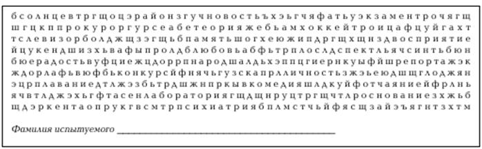 Практическое занятие 3. Психологическая диагностика когнитивных способностей. Методика Мюнстерберга Направлена на определение избирательности внимания. Рекомендуется для использования при профотборе на специальности, требующие хорошей избирательности и концентрации внимания, а также высокой помехоустойчивости. Инструкция: среди буквенного текста имеются слова. Ваша задача как можно быстрее считывая текст, выделить эти слова. Время работы — 2 минуты. Пример: рюклбюсрадостьуфркнп Методика применяется как в группе, так и индивидуально. Оцениваются количество выделенных слов и количество ошибок (пропущенные и неправильно выделенные слова).