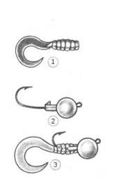 Рис. 28. Классический вариант твистера: 1 — твистер, 2 — джиг-головка, 3 — приманка в сборе. Плоский изогнутый хвост твистера при движении (не только при активной проводке, но и при падении на дно) совершает волнообразные колебания, придавая приманке сходство с живым организмом. Но с каким? Авторы многих рыболовных книг без тени сомнений повторяют вслед за каталогами производителей: твистеры «имитируют различных червей». Может, в Америке и водятся черви, движущиеся в воде подобно твистеру, но в наших реках и озерах я таких не замечал. Обычные земляные черви, брошенные водоем, извиваются на дне; пиявки плавают, извиваясь в вертикальной плоскости и в каждый момент своего движения напоминая положенную на бок латинскую букву «s». Личинки миноги, которых можно отнести если не к червям, то к червеобразным существам, тоже плавают весьма отличающимся от движений твистера образом. И вовсе уж непонятно, за какое водное животное может принять щука или судак твистеры более сложной формы, изображенные на рис. 29. Некоторые рыболовы именуют двухвостый твистер «лягушонком» — но каждый видевший, как плавает лягушка, согласится, что название это весьма условное.
