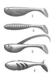 Рис. 30. Виброхвосты: 1 — классическая модель; 2 — виброхвост с кольчатым телом; 3 — виброхвост с дополнительным плавником; 4 — виброхвост с вырезами на теле, создающими дополнительные колебания. Из всех виброхвостов наиболее широко используется классическая модель (рис. 30.1) в виде рыбки. В некоторых виброхвостах для создания дополнительных гидроакустических колебаний используются элементы, присущие твистерам: кольчатое тело (рис. 30.2) или гибкий спинной плавник, напоминающий своей игрой хвост твистера (рис. 30.3). Силиконовые рыбки с поперечными вырезами (рис. 30.4) отличаются увеличенной гибкостью и амплитудой колебаний — у них изгибается и «играет» не только хвост, но и большая часть тела. Предпринимаются многочисленные попытки использовать в силиконовых приманках акустические эффекты и различные пахучие добавки, то есть звук и запах. Иногда используются небольшие бубенчики, которые либо ввинчиваются в тело приманки на проволочном штопоре, либо крепятся в особый карман на хвосте твистера. Существуют джиг-головки с подвешенным к ним металлическим лепестком — при колебаниях приманки он ударяется о головку и создает дополнительные звуки. Для создания «пахучего следа» приманки натирают специальными пастами либо заливают ароматизатор в полость в теле твистера либо виброхвоста. Некоторые российские рыболовы обходятся без специальных полостей и покупных ароматизаторов: делают в теле приманки глубокий, но не сквозной разрез (рис. 31) и помещают туда ватку, пропитанную свежей кровью (добыть ее на рыбалке нетрудно — достаточно рассечь жабры только что пойманной, еще живой рыбы).