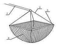 Рис. 43. Подъемник для ходовой ловли: 1 — шест, 2 — стропы, 3 — рама из стального прутка, 4 — сеть. Изготовляется подъемник для ходовой ловли просто: круглый стальной пруток длиной 3,2–3,4 м и диаметром 6–8 мм тщательно ошкуривается и покрывается в 2–3 слоя водостойкой краской темного цвета. Затем из прутка сгибается квадрат со стороной 80–85 см. На него надевается и равномерно расправляется квадратный кусок сети 1х1 м с ячеей 10 мм. Концы прутка соединяются (вставляются натуге в отрезок алюминиевой трубки длиной 5–6 см и с соответствующим внутренним диаметром). Можно сделать каркас разборным, из четырех прутков, соединенных уголками из такой же трубки. Для надежности края сетки пришиваются к ободу капроновым витым шнурком диаметром 1,5 мм. К углам обода крепятся стропы, каждая длиной около 1 м. Поскольку стропы должны обладать некоторой жесткостью, лучше сделать их не из шнура, а из медной изолированной проволоки диаметром 4–5 мм (стропы из алюминиевой проволоки получаются слишком ломкими, а из стальной — слишком пружинистыми). Наверху стропы соединяются вместе и надежно крепятся короткой (10–15 см) веревкой к четырехметровой жерди, желательно хорошо высушенной и легкой. Снасть готова, но поймать ей приличную рыбу не так-то просто, обычные способы ловли подъемником не принесут успеха. Лов производится на небольших речках и ручьях, но выбирать их надо тщательно: подходят малые притоки больших рек невдалеке от места впадения, ручьи, впадающие в богатые рыбой озера. Очень хороши маленькие речки, которые перекрывают дамбами в сельскохозяйственных целях (например, для полива), образуя небольшие водохранилища, — уровень воды в таких водоемах постоянно колеблется, берега зачастую представляют из себя голые глиняные склоны, на которых из-за постоянной смены уровня не успевает укорениться ни водная, ни сухопутная растительность. В результате рыба, привыкшая метать икру на затопленную прибрежную растительность, — не находит места для нереста, во множестве идет вверх по течению в поисках удобных нерестилищ, и попадает в узкую и неглубокую речку. Так же представляют интерес узкие и неглубокие верховья речек, на которых в нескольких километрах ниже по течению имеются богатые рыбой омута. Время для ловли надо выбирать не менее тщательно, чем место, иначе будут попадаться только постоянно живущие в речке рыбы, обыкновенно некрупные. Первыми поднимаются в самые верховья язи (ход их бывает только в верховьях или же на малых притоках больших и средних рек), спасаясь от мутной воды. Календарные сроки этого хода назвать трудно, они не только разнятся в зависимости от конкретного места, но и на одном и том же водоеме могут сдвигаться на две-три недели в ту или иную сторону, в зависимости от того, ранняя или поздняя выдалась весна. Но поднимается язь всегда очень рано, когда на большой реке продолжается ледоход. Щука начинает свой подъем к нерестилищам позже, иногда ее ход против течения совпадает со скатыванием язя, но чаще между ними проходит какой-то промежуток времени. Надо учитывать, что щука вообще-то к дальним нерестовым путешествиям не склонна, и чем больше пригодных для нереста мест ниже по течению, тем меньше щук поднимается в верховья. Верна и обратная зависимость. Например, если зима была бесснежной и по весне вода в озере не поднялась, не затопил
