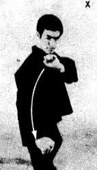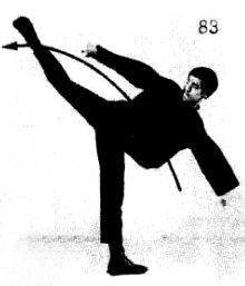 Затем, перебирая ногами, продвиньтесь вперед или просто выполните быстрое движение вперед, описанное в первой книге. Как только левая нога коснется пола, нанесите круговой удар, показанный на фотографии 82.