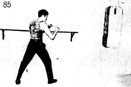 Это зависит от положения противника относительно Вас. Он должен находиться справа от вас, если вы находитесь в правосторонней позиции, чтобы вы могли нанести удар в пах. Круговой удар ногой, нанесенный выше колена, редко употребляется, т. к. не является особенно эффективным. Он проходит слишком короткий путь, чтобы быть достаточно сильным. Удар ногой из поворота чаще всего является контрударом. Его очень полезно применить против агрессивного противника, который постоянно нападает по прямой линии. Опасно использовать этот удар против борца или противника, предпочитающего оборонительную позицию, который часто переходит в контрнападение и постоянно ожидает, чтобы вы первым начали нападение. Опасно отворачиваться от такого противника, а вы вынуждены это сделать, выполняя удар ногой из поворота. Удар ногой из поворота труднее выполнять, т. к. вы должны повернуться и находиться спиной к противнику. В этом случае может легко случиться, что вы неправильно оцените ситуацию и положение цели. Откровенно говоря, необходимо несколько часов тренировок, прежде чем вообще вы сможете поразить цель. Этот удар не похож на круговой удар, но подобен удару ногой назад. В джит кун до это один из редких ударов, при котором используется левая нога. Удар ногой из поворота лучше всего отрабатывать на тяжелом мешке. Станьте от мешка на расстоянии, равном длине вашей ноги, в положении защиты как на фотографии 85.