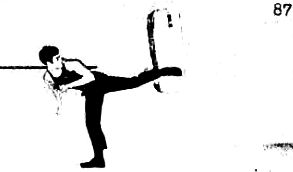 Корпус тела должен быть как бы устремленным по направлению к мешку в момент выполнения удара. Как и при ударе ногой в сторону, вы должны выполнить резкое боковое движение в момент касания цели и совершить рывок ногой после удара, как показано на фотографии 88.