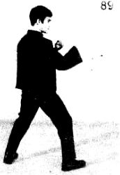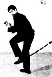 После удара очень тяжело сохранить равновесие, т. к. вы совершили вращение и вдобавок выполнили рывок ногой, поэтому тренируйтесь, чтобы уметь сохранять равновесие. Удар ногой из поворота является неожиданным оружием для контрнападения. Этот удар может помочь и в борьбе против опытного противника, умеющего хорошо защищаться. Но для хорошего его выполнения требуется много тренироваться. Прежде всего научитесь выполнять этот удар медленно. Станьте в положение защиты, как на фотографии 89, а затем повернитесь стоя на передней части ступни вашей немного согнутой ноги как на фотографии 90. Левая нога согнута и готова к удару.