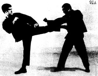 На следующей фотографии (С) Ли блокирует левой рукой и одновременно наносит низкий удар вперед правой ногой.