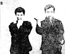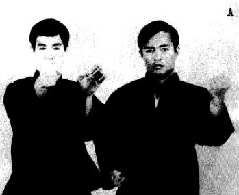 Фотография В показывает, что почти одновременно с блокадой можно выполнить и контрудар. Но классические стили не рекомендуют это делать, т. к. учат, что блокаду необходимо отделить от контрудара. На фотографии А Брюс Ли находится слева, а на фотографии В — справа.
