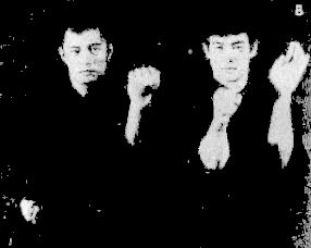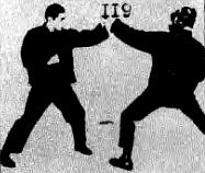 Здесь правая рука выполняет блокировку, а левая — контрнападение. Как и в других блокадах, выполняемых в классическом стиле, здесь для контрнападения необходимо два движения, вместо одного, как в джит кун до. На следующей серии фотографий два борца классического стиля стоят друг против друга (фото 118).