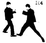 В классических стилях китайского бокса и каратэ блокировка осуществляется движением руки вниз и наискось, как видно на правой стороне фотографии 102 в то время, как другая рука прижата к боку. Недостаток этого способа блокировки в том, что контрудар осуществляется намного медленнее из-за того, что другую руку вы должны сначала прижать к боку, а затем нанести ею удар, а это означает, что вам необходимо сделать два движения. В джит кун до блокада и контрудар являются одним движением обеих рук. Второй недостаток классического способа блокировки заключается в том, что тело, особенно его верхняя часть, остается постоянно открытым для нападения противника (фотография А). На фотографиях Ли демонстрирует применение внутренней низкой блокады. На фото 103 Ли стоит в положении защиты и смотрит на противника.