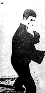 На следующей серии фотографий Брюс Ли объясняет, как используется высокая внешняя блокада для защиты от удара кулаком в голову. На фото 106 Ли ждет первого движения противника.