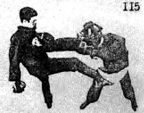 Ли остается на месте и почти одновременно наносит удар ногой вперед в пах противника (посмотрите на фото 115).