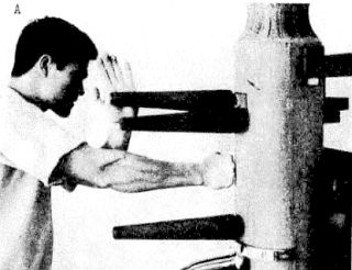 На своем деревянном манекене Ли прикрепил в середину его еще одну «руку», чтобы иметь возможность отрабатывать блокировку низких ударов (фотография А).