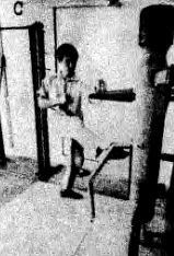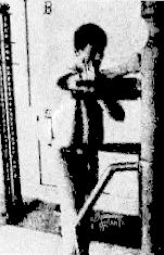 Это более надежный способ защиты, чем тот, о котором мы говорили и который показан на фотографиях, расположенных выше, т. к. здесь Ли не должен совершать никаких движений для нанесения контрудара, потому что нога длиннее руки. Когда Ли не мог найти партнера для упражнений, он тренировался с помощью деревянного манекена. На трех фотографиях на странще показано, как Ли отрабатывал блокировку. На фотографии А он блокирует левой рукой, а правой одновременно наносит контрудар.
