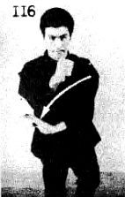 На фото 113, 114 и 115, иллюстрирующих приемы высокой внешней блокады, Ли комбинирует эти приемы с приемами контрудара ногой. На фото 113 и 114 вы видите, как Ли блокирует директ правой рукой, направленный противником в его лицо.