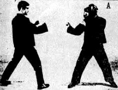 Борец, находящийся слева, стоит в классической позиции и пытается нанести удар кулаком в лицо, противник блокирует этот удар (фото 119).