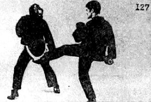 Ли использует эту ситуацию и поворачивает противника до тех гор, пока тот не окажется спиной к нему, а затем наносит контрудар ногой вперед в пах (фото 127).
