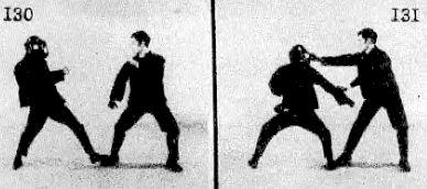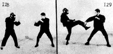 Против борца, стоящего в левосторонней позиции, Ли применяет тот же прием: движется назад синхронно наступлению противника. У Ли есть много времени для защиты, т. к. противник осуществляет нападение левой ногой, стоящей позиди. Ли немного отошел назад, потому что нападение левой ногой не имеет большой досягаемости, как видно на фотографии 129.