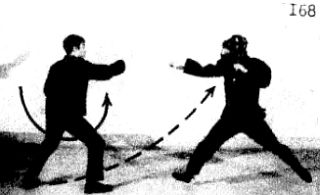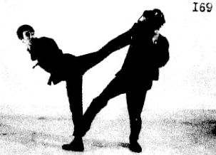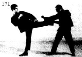 Удар ногой из поворота является неожиданным оружием контратаки. Не рекомендуется его использовать для нападения. Этому удару трудно научиться, но когда однажды вы им овладеете, он может стать наилучшим оружием против опытных противников. Удар ногой из поворота нужно осторожно использовать, чаще всего против агрессивных противников, которые постоянно нападают. Очень тяжело его применить против борца, который хорошо защищается и часто выполняет контрнападения. Ли, его противник находятся на большом расстоянии, как показано на фотографии 167.