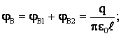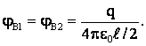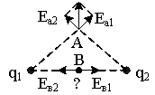 Решение: направления векторов напряженностей в точке А и В показаны на чертеже (рис.). Напряженности и потенциалы в точке А от каждого заряда, удаленного от точки А на Тогда для результирующего поля в точке А: ЕА ≈ 1,4·103 Н/Кл. φА ≈ 840 В. Векторы напряженности в точке В от каждого заряда равны и противоположны, а потенциалы от каждого заряда: Поэтому для суммарного поля в точке В: Ев = 0; φв ≈ 1200 В Ответ: согласно рисунка для точек А и В: φА = 840 В; ЕА = 1,4·103 Н/Кл; φв = 1200 В; Ев = 0