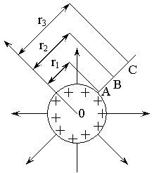 Задача №6. Положительно заряженный металлический шар (рис.) создает поле, напряженность которого в точке А ЕА = 100 В/м, а в точке С – Ес = 36 В/м. Какова напряженность поля в точке В, лежащей посередине между точками А и С? Шар находится в воздухе.