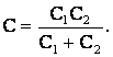 Решение: на рис. б изображена схема, эквивалентная данной схеме. Конденсаторы С1, С2 и С3 соединены последовательно. Их общая емкость С′ = С/3. Параллельно этой цепи подключен конденсатор С4. Значит, емкость цепи между точками D и Е: Теперь имеем схему, изображенную на рис. в. Емкость этой батареи Сб найдем из формулы для последовательного соединения конденсаторов: откуда Сб = 4 мкФ.
