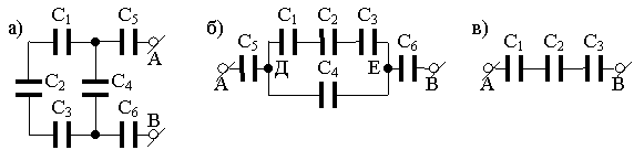 Задача №15. Найти емкость батареи конденсаторов, соединенных по схеме, приведенной на рис. а. Все конденсаторы имеют одинаковую емкость С = 11 мкФ.
