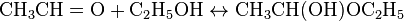 Етаналь у водному розчині гідратований на 51 %[3]. Взаємодія зі спиртами[ред. • ред. код] Спирти, як і вода, оборотно приєднуються до етаналю з утворенням півацеталей. В спиртових розчинах півацеталіперебувають у рівновазі з оцтовим альдегідом. Так, в етанольному розчині етаналю міститься близько 30 % півацеталю (1-етоксиетанолу) (в розрахунку на альдегід).