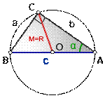 R - радиус описанной окружности O - центр описанной окружности с - гипотенуза a, b - катеты α - острый угол CAB