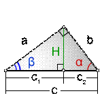 a, b - катеты с - гипотенуза c1, c2 - отрезки полученные от деления гипотенузы, высотой α, β - углы при гипотенузе