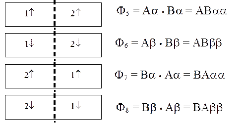 Первый этап описания заключается в перечислении всех возможных исходов такого разрезания молекулы в отношении способа распределения электронов по двум отсекам. При этом мы должны учесть не только сам факт попадания электрона в конкретный "атом", но и его состояние — характер пространственного и спинового движения, выражающийся двумя сомножителями волновой функции (АСО). Можно также полагать, что в результате процедуры разрезания образующиеся атомы водорода могут получатся не только в основном (1s), но и в одном из возбужденных состояний (2s, 2p и т.д.), причем каждая такая АО может иметь в качестве спинового множителя либо a-, либо b-функцию. В идеале все возможные варианты должны быть учтены. Ясно, однако, что этот идеал недостижим, так как число возможных вариантов бесконечно велико. На практике мы должны использовать ограниченный базис, включающий только такие исходы, вероятность которых достаточно велика. Правило, согласно которому осуществляется отбор, сводится к следующему: вероятность реализации некоторой резонансной формы тем больше, чем меньше ее энергия. Поэтому в первом приближении мы можем полагать, что атомы, составляющие резонансные формы, могут находиться только в основном электронном состоянии 1s. Тогда у каждого электрона возможны всего две АСО: (1s×a) и (1s×b). При этом пространственная часть АСО будет центрирована либо на ядре Ha, либо на ядре Hb. Для упрощения записи обозначим эти пространственные части буквами А и В соответственно. Теперь легко перечислить все допустимые исходы разрезания молекулы водорода на два "атома" — резонансные формы. Для удобства разобьем их на группы.
