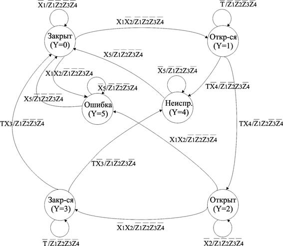 По словесному описанию и приведенной схеме связей построим граф переходов автомата (рис. 3) в соответствии с концепцией, изложенной выше. Подробно методика разработки графа переходов излагается в курсе «Основы логического управления».