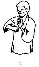 2) Боковой удар Наносится по дугообразной траектории снаружи вовнутрь в горизонтальной плоскости. Кулак принимает горизонтальное положение пальцами вниз. Рука во время удара всегда согнута в локте и никогда не распрямляется полностью (рис. 3).