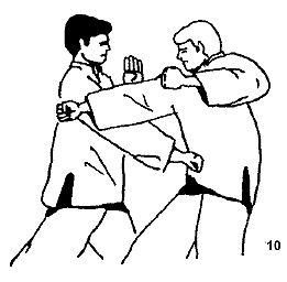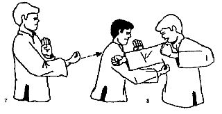 4) Буравящий удар Напоминает боксерский апперкот, однако отличается от него траекторией движения. В ВИН ЧУН этот удар выполняют вперед и немного вверх. Кулак принимает горизонтальное положение, пальцами вверх. В конечной фазе удара локоть не выпрямляется (рис. 7). На рисунке 8 изображено применение буравящего удара с одновременным блоком ПАК САУ.