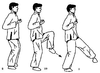 Останавливающий блок ногойИсходное положение. Примите фронтальную стойку ДЖОР МА БУ (рис. 9). Поднимите согнутую в колене левую ногу вверх, направляя носок вправо (рис. 10). Выпрямите ногу, нанося стопорящий удар ребром стопы вперед-вниз (рис. 11).