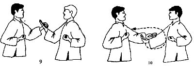 Вы по дугообразной траектории выводите свою руку из-под руки партнера и выполняете удар НОУ МУН ЧУЙ, на что Ваш партнер реагирует блоком ТАН САУ (рис. 7). Затем необходимо вернуться в исходное положение (рис. 8). Но теперь Ваш партнер держит левую руку в позиции ТАН САУ, а Вы свою правую руку в позиции ФОК САУ. Это произошла смена ролей. Повторите упражнение, но теперь начинает его Ваш партнер с удара ладонью вперед.