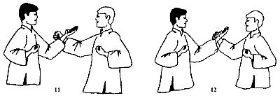 Вы выводите свою руку из-под руки партнера и наносите удар НОУ МУН ЧУЙ, который Ваш партнер нейтрализует блоком ТАН САУ (рис. 11). Вернитесь в исходное положение, но сменив роли (рис. 12). Продолжите упражнение, но теперь первым начинает Ваш партнер.