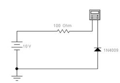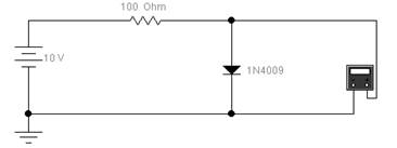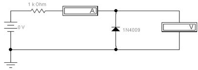 Цель работы: закрепить теоретические знания о диодах и стабилитронах; научиться рассчитывать и измерять токи, напряжения и сопротивления диодов и стабилитронов; экспериментально получить вольтамперные характеристики диода и стабилитрона; исследовать стабилизирующие свойства стабилитрона. Используемое оборудование и средства: персональный компьютер, программа Electronics Workbench. 1. Измерение напряжения на диоде и вычисление тока через диод: Собираем и включаем схему: