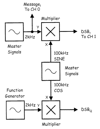Блок-схема представлена на рисунке 5.4. Заметьте, что два уникальных сообщения с частотой 2кГц соединены со входами разным перемножителей. В качестве несущих используются синусоида и косинусоида с частотой 100кГц, т.е. необходимая разность фаз соблюдается. 3. Запустите NI ELVIS II Oscilloscope VI и настройте его: - Coupling AC - Trigger Type Edge - Trigger Source CH 0 4. Убедитесь, что сигнал DSBSC модулирован – огибающие должны формировать копию информационного сообщения. 5. Пересоедините входы осциллографов, как показано на рисунке 5.5 и проделайте то же самое для второго сигнала.