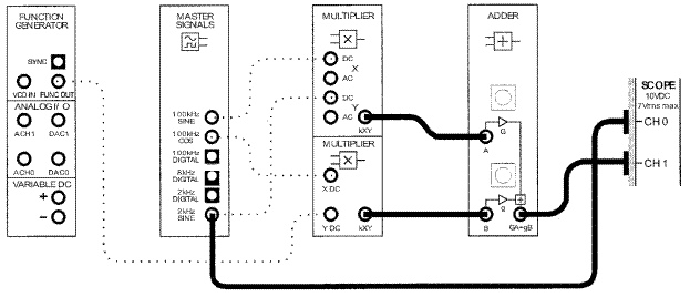 Рисунок 5.7. 7. Отсоедините провод, идущий ко входу А сумматора. Регулируя ручку g установите выходное напряжение равным 4В, затем присоедините провод обратно. 8. Отсоедините провод, идущий ко входу В сумматора. Регулируя ручку G установите выходное напряжение равным 4В, затем присоедините провод обратно.