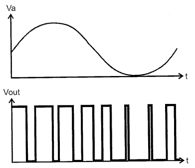Компаратор имеет два входа: на один подается аналоговый сигнал, на другой пилообразное напряжение. Когда мгновенное значение напряжения на аналоговом входе меньше, чем мгновенное значение пилообразного напряжения, на выходе компаратора появляется сигнал логического 0. Когда мгновенное значение напряжения на аналоговом входе больше, чем мгновенное значение пилообразного напряжения, на выходе компаратора появляется сигнал логической 1. Таким образом, сигнал на выходе компаратора представляет собой последовательность импульсов, ширина которых является функцией величины напряжения на аналоговом входе устройства. Рисунок 6.2 демонстрирует сравнение напряжений на выходе компаратора при двух разных входных постоянных напряжениях.
