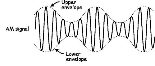 На следующем рисунке точечками обозначены огибающие линии АМ сигнала. Верхняя огибающая в точности повторяет информационное колебание, нижняя также повторяет сообщение, но в инвертированном виде.