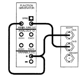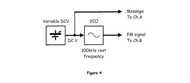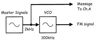 Положительный выход VariableDCPowerSupplies используется для обеспечения простого DC сигнала, а FunctionGenerator`sVCOреализует ФМ модулятор с частотой 100 kHz.