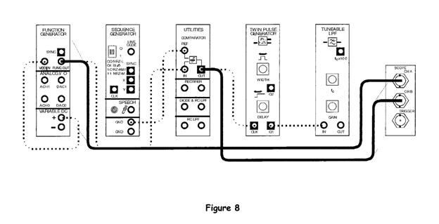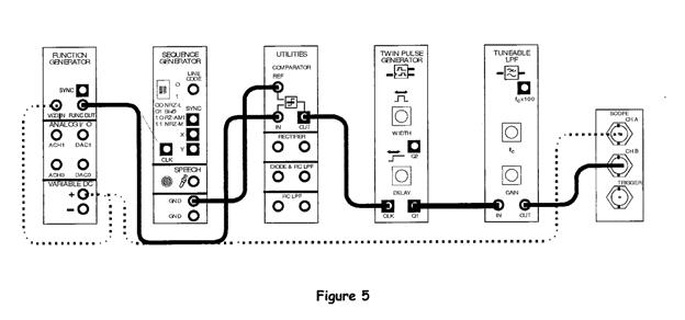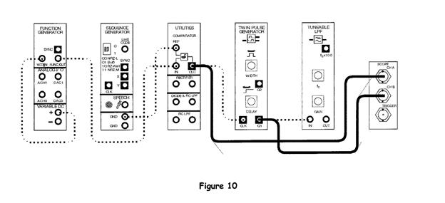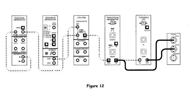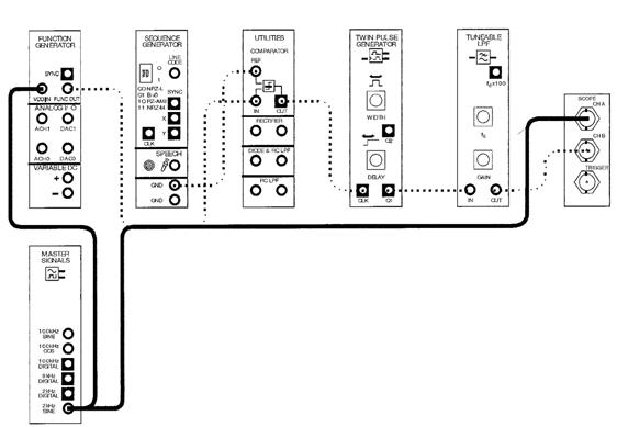 24. НапанелиDATEx SFP определите Twin Pulse Generator module иповерните Width противчасовойстрелки. 25. Поверните Delay против часовой стрелки. 26. На панели DATExSFPTuneableLow-passFiltermodule и установите Gain примерно в среднее положение. 27. Поверните Cut-OffFrequencyAdjust приблизительно в среднее положение. 28. Соберите схему: