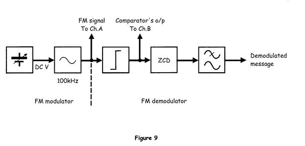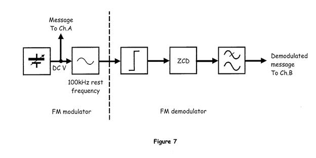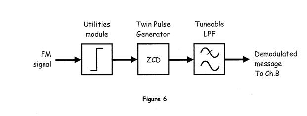 Кроме того, данная схема может быть представлена блок-схемой на рисунке 7. Компаратор на Utilitiesmodule используется для фиксации ЧМ сигнала, фактически превращая его в прямоугольную последовательность. Положительный перепад TwinPulseGeneratormodule используется для реализации ДПН. Для завершения построения ЧМ демодулятора используется TuneableLow-passFiltermodule, который выделяет изменения постоянной составляющей на выходе TwinPulseGenerator.