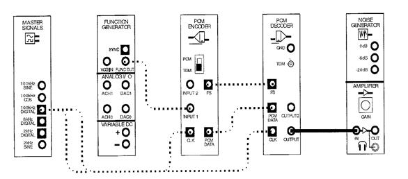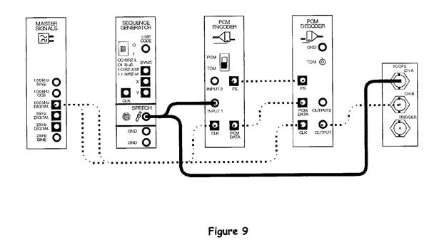 165. Сравните звучание двух сигналов. Вы должны заметить, что они подобны, но явно отличаются. Вопрос 2 Что должно быть сделано с выходом ИКМ декодера для правильного восстановления сигнала сообщения? Часть 3 – Кодирование и декодирования речи. 166. Закройте окно Анализатора Спектров и запустите Осциллограф. 167. Настройте осциллограф таким образом, чтобы видеть приблизительно два цикла исходного и дискретизированного сигналов. 168. Полностью отсоедините усилительный модуль от уже имеющейся схемы соединения. 169. Отсоедините штекеры от выхода Функционального Генератора. 170. Модифицируйте схему соединения, как показано на рисунке 9: