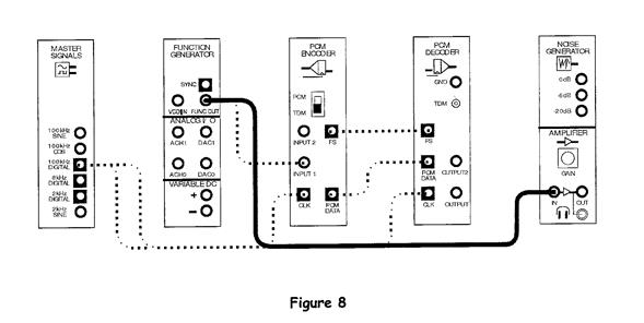 158. На модуле усилителя поверните ручку Gain полностью против часовой стрелки до упора. 159. Подсоедините наушники в соответствующий разъем. 160. Оденьте наушники. 161. Теперь начните поворачивать ручку Gain по часовой стрелки до тех пор, пока не установится удобный уровень громкости. 162. Прослушайте дискретизированный сигнал запомните его звучание. 163. Отсоедините провод усилительного модуля от выхода модуля ИКМ Декодера. 164. Модифицируйте схему соединения, как показано на рисунке 8, сохраняя соединения осциллографа.