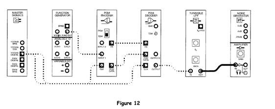 177. Медленно поворачивайте ручку Cut-offFrequencyAdjust на модуле Регулируемого ФНЧ по часовой стрелке, остановившись на моменте, когда сигнал сообщение будет восстановлен (игнорируя сдвиг фазы). Два сигнала являются абсолютно одинаковыми. Давайте посмотрим, что скажет вам ваш слух. 178. Добавьте усилительный модуль к схеме соединения, как показано на рисунке 12, оставляя все имеющиеся соединения осциллографа.